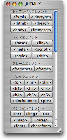JHTML Xには、タグ編集を行うための様々なダイアログが収められています。これらのダイアログはJHTMLのメニューから直接呼び出すこともできますが、通常はJedit XのマクロメニューやHTML編集メニューからAppleScript経由でコールされます。このプログラムはAppleScript Studioで開発され、ソースコードを公開しています。
