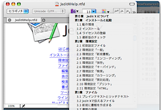 RTF)書類、添付ファイル付きリッチテキスト(RTFD)書類、MS Word書類、OpenDocument書類、 Jedit4書類、SimpleText書類の読み込みが可能です。書き込みは、プレインテキスト書類、リッチテキスト(RTF)書類、添付ファイル付き (RTFD)書類、MS Word書類、OpenDocument書類をサポートしています。
