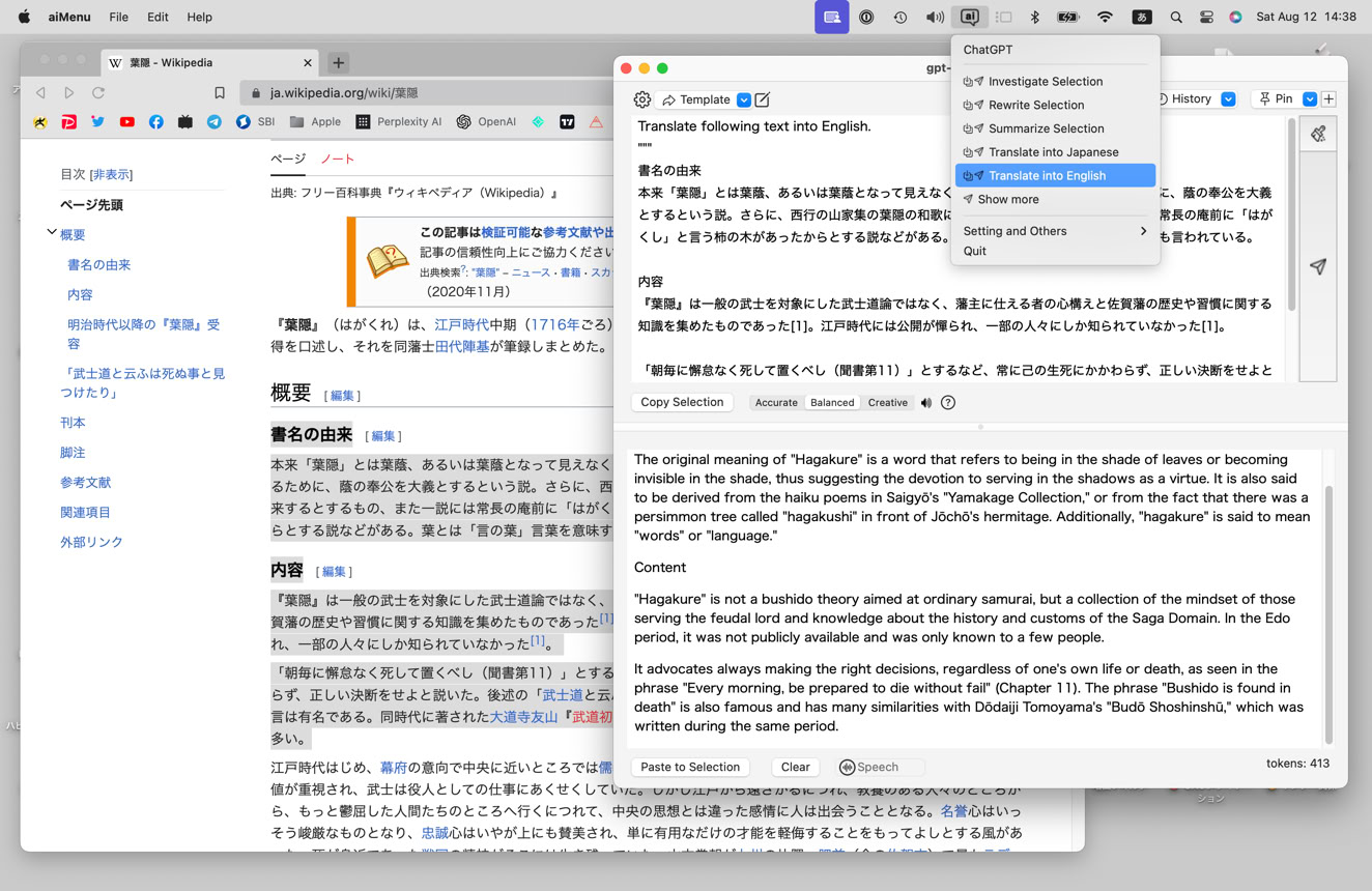 aiMenu is an AI utility that allows users to call ChatGPT with just one touch from the services menu, the status menu or global hot keys for any selected text in any application such as email, browser, editor, spreadsheet, development tool, etc. The default menu includes options like "Investigate Selection, Rewrite Selection, Summarize Selection, Translate into Japanese, Translate into English," but users can customize the menu items as desired.