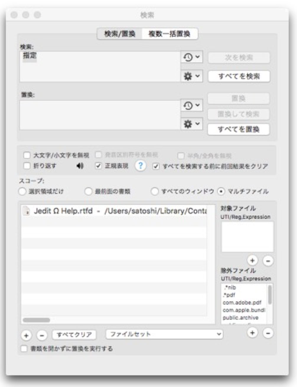 シンプルな検索置換機能(無料版)に加えて、Jedit Ωオリジナルの検索検索/置換機能では、正規表現のサポート、高速化な一括置換、数百数千セットの置換をまとめて行える複数一括置換、マルチファイル検索、検索結果ウインドウでの置換など、充実の検索機能を備えています。